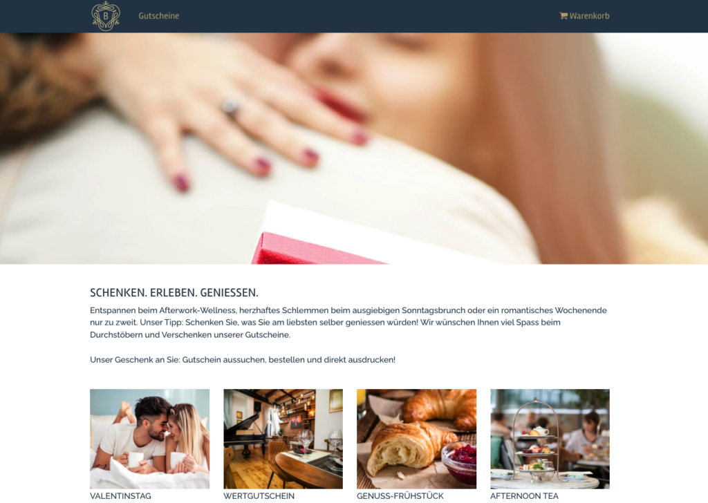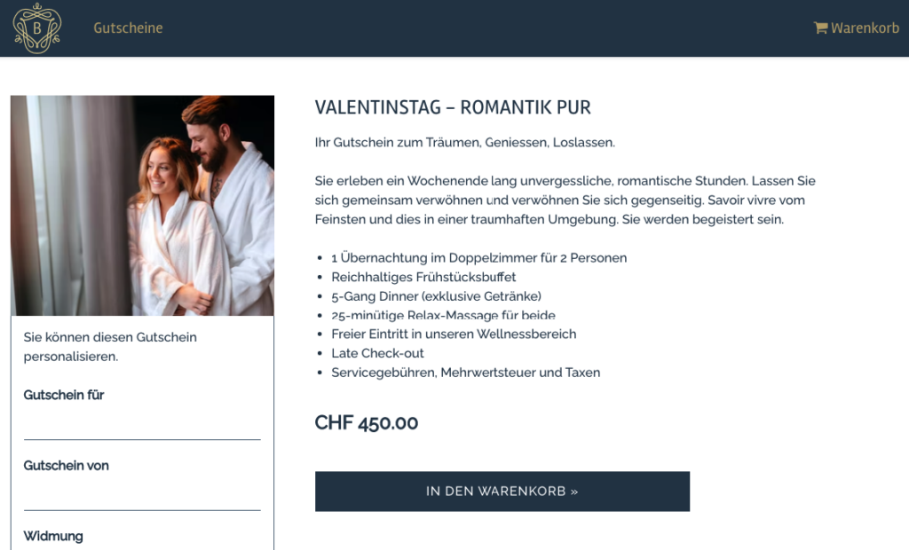Ob Sie Gutscheine eigens für den Valentinstag kreieren oder bereits passende Angebote in Ihrem Onlineshop aufgeschalten haben: Gruppieren Sie diese Gutscheine zu einer Kategorie «Valentinstag». So können sich Ihre Shopbesucher bequem inspirieren lassen und den passenden Gutschein aussuchen.